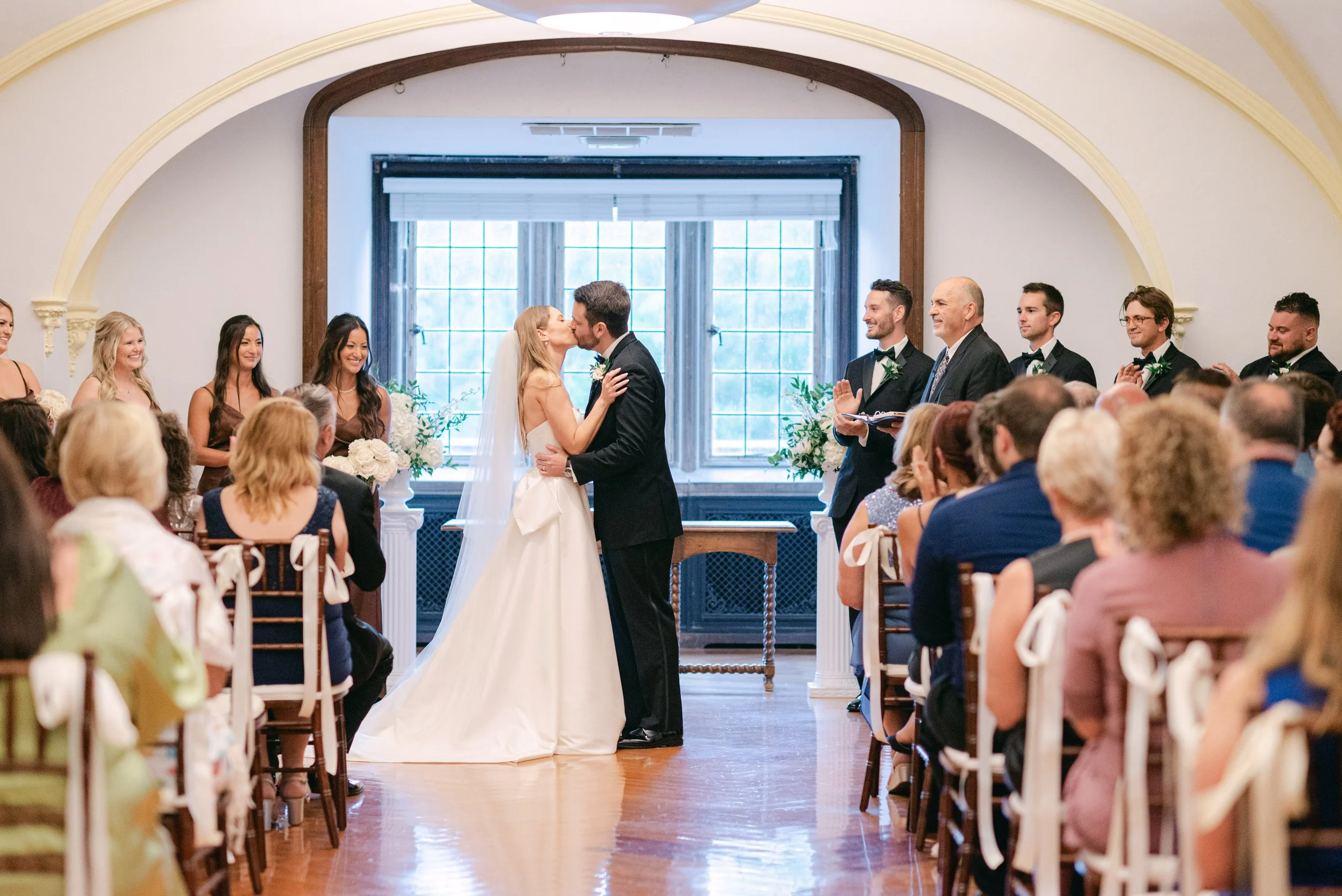 The courtyard of Laurel Hall created the perfect backdrop for a heartfelt ceremony. Guests looked on as vows filled with laughter and tears echoed against historic stone walls. When Victoria walked down the aisle, emotion rippled through the crowd — and when their kiss sealed the moment, the celebration felt like a collective exhale of joy.