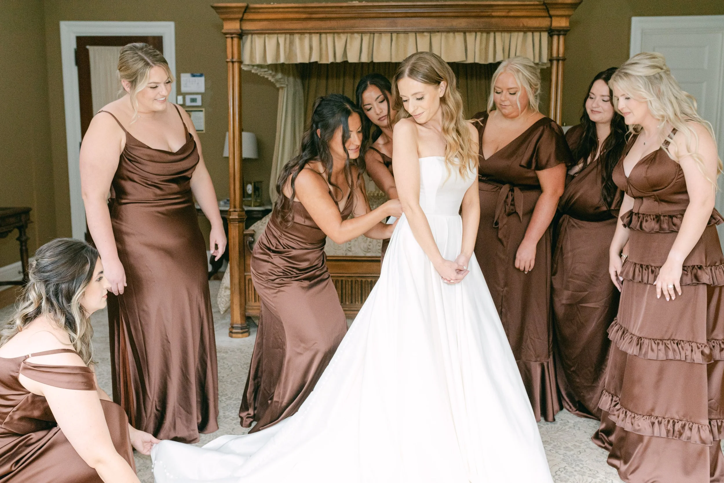 Laurel Hall’s grand bridal suite was filled with anticipation as Victoria slipped into her gown. Sunlight streamed through arched windows, casting a glow across delicate lace, vintage woodwork, and laughter from her closest friends. Every detail carried the weight of the day ahead — tender, unhurried, and timeless.